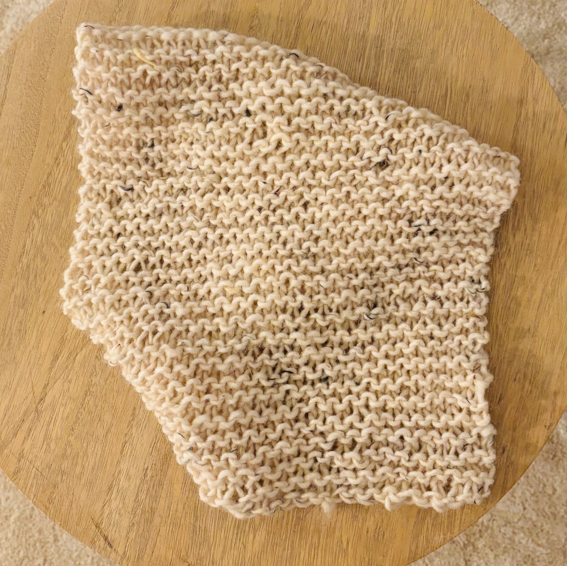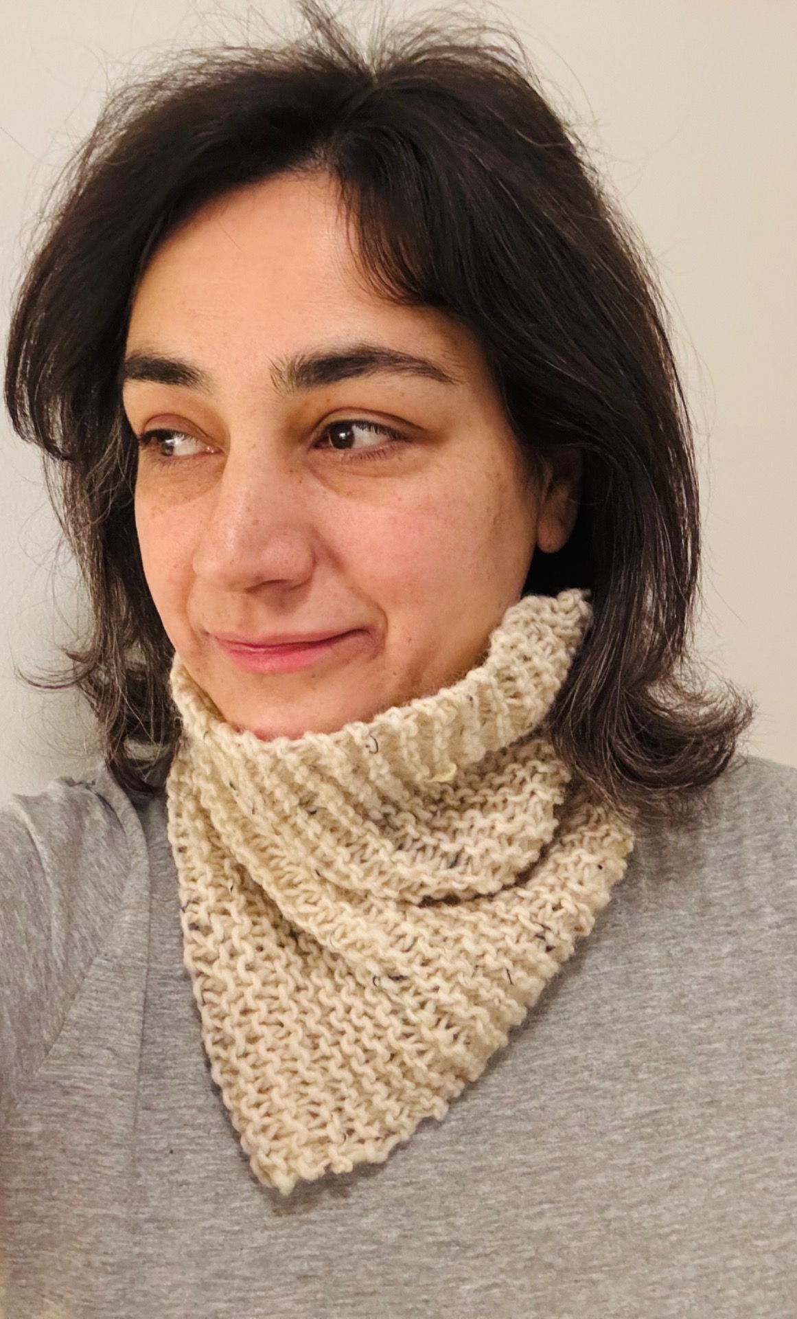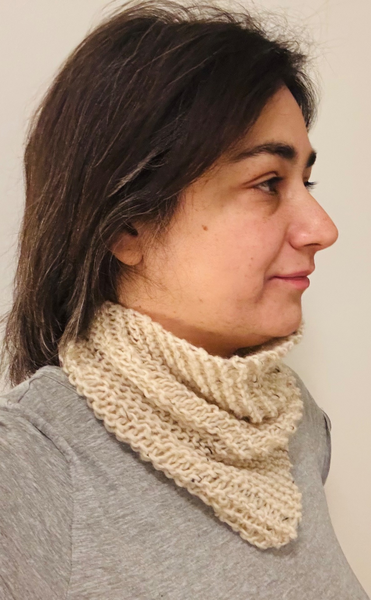 En handstickad halskrage i en ljus, neutral färg. Den har en enkel, men ändå elegant design som passar bra till många olika stilar. Halskragen är stickad i ett tätt mönster som ger värme och komfort. 85% ull, 10% akryl och 5% viskos.