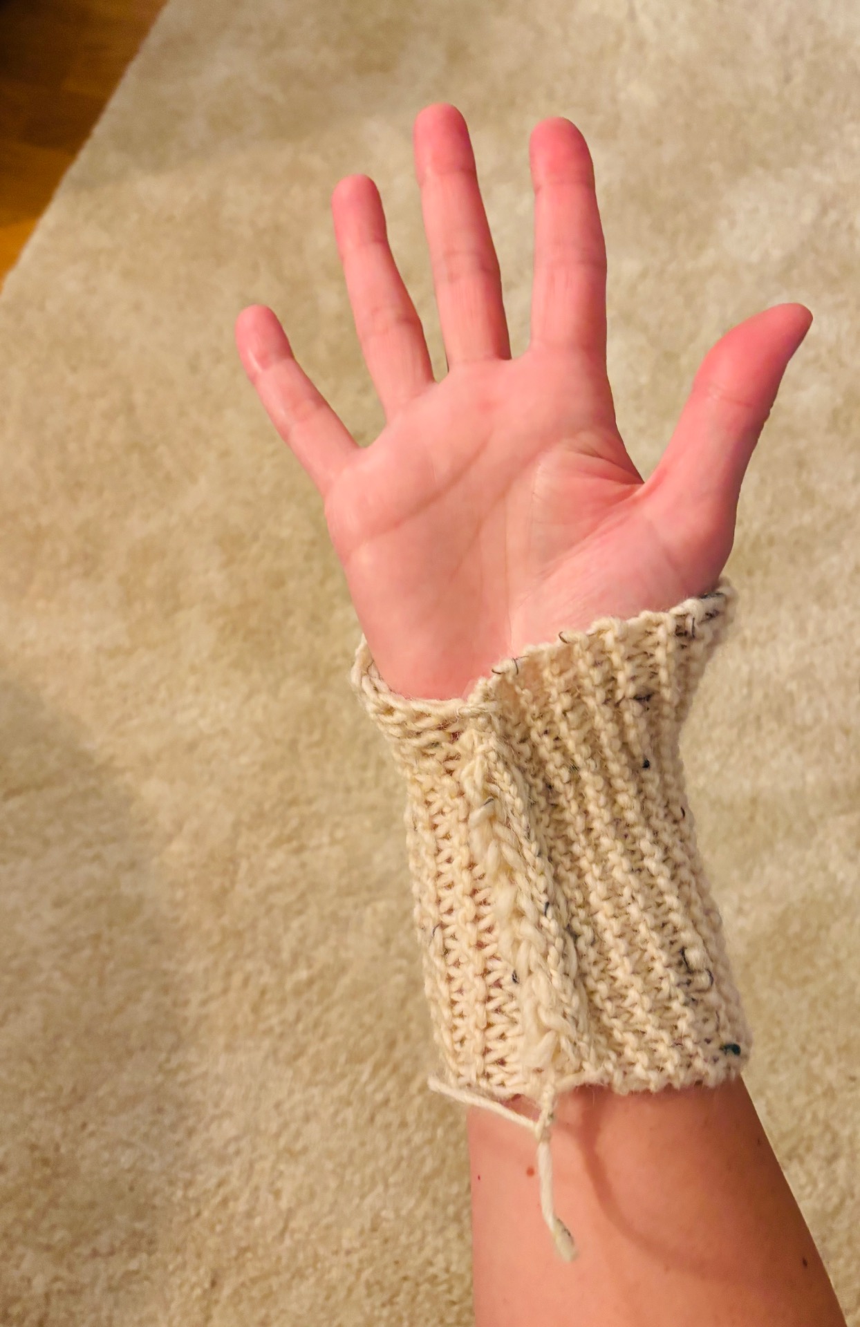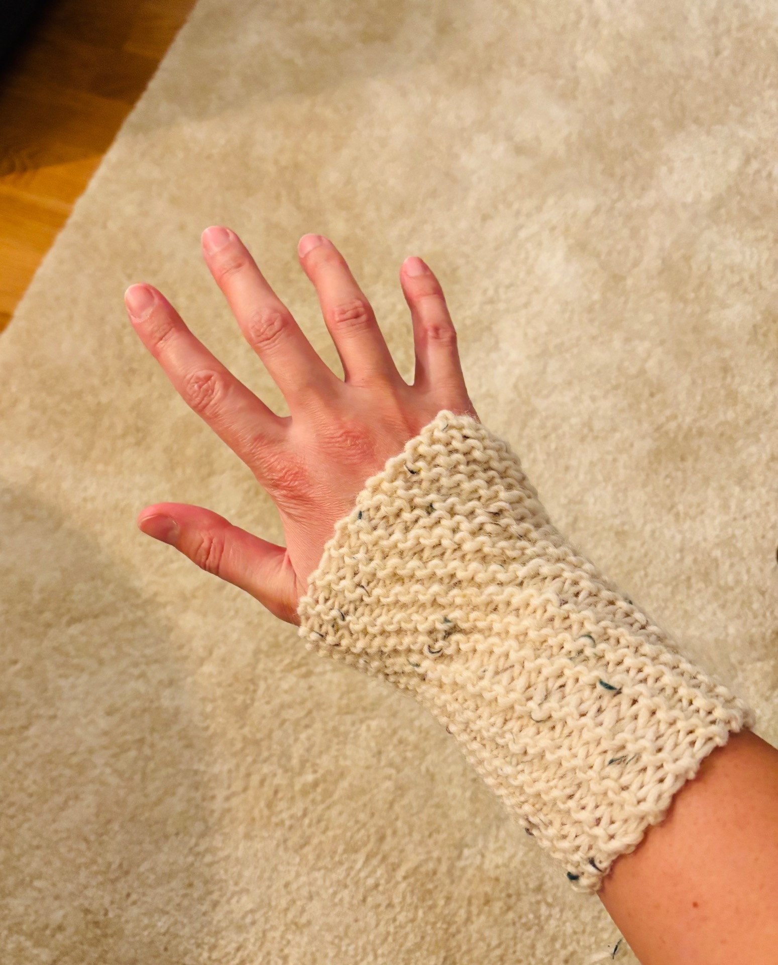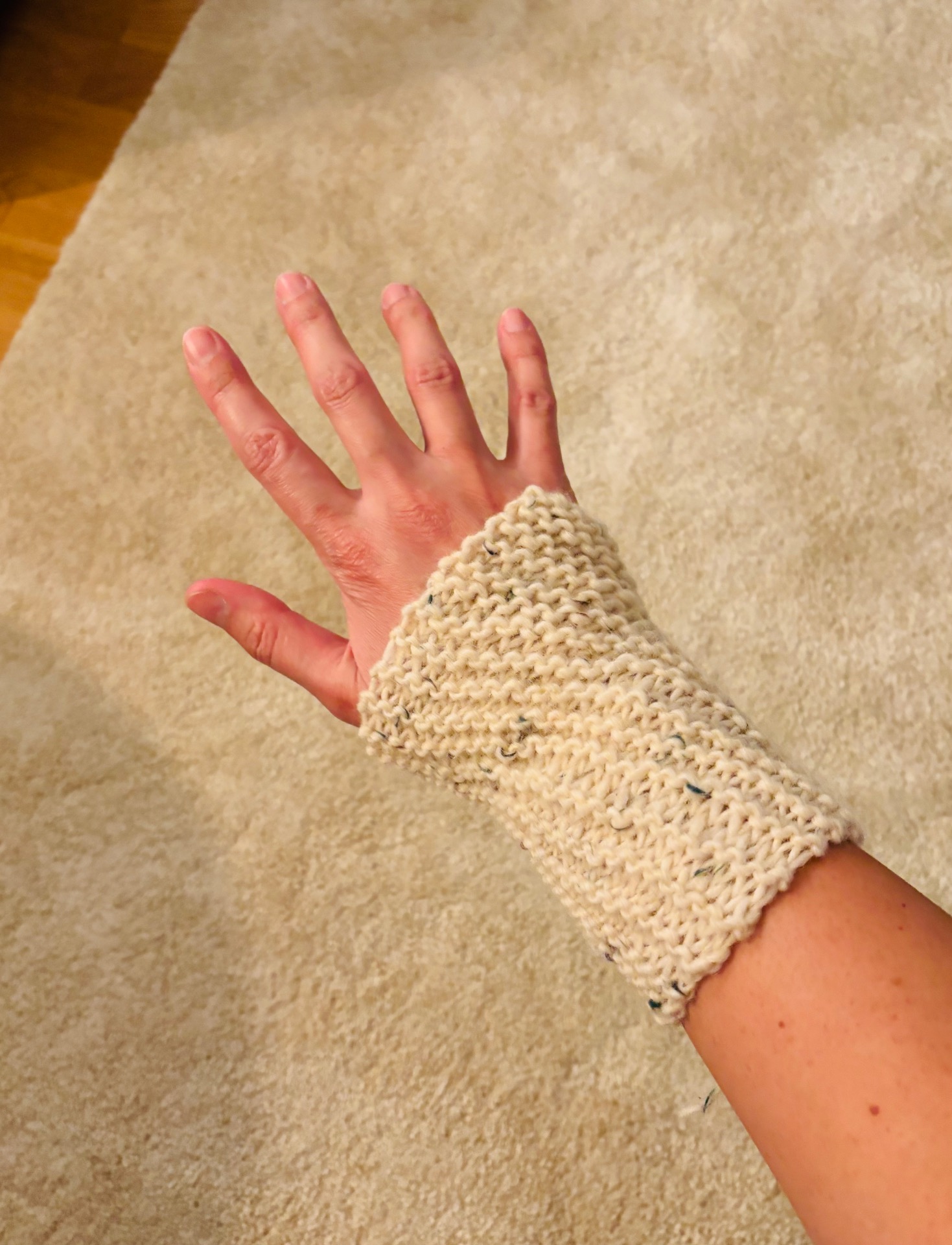Handstickad handledsvärmare i en ljus färg med små färgade prickar. Den har en ribbstickad kant och en öppen design för tummen. 85% ull, 10% akryl och 5% viskos.