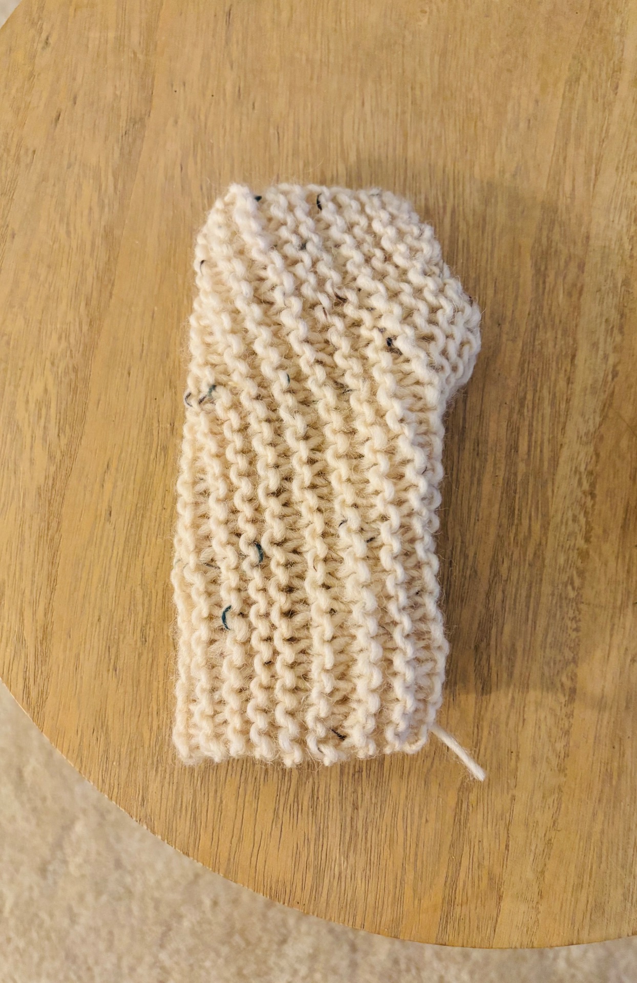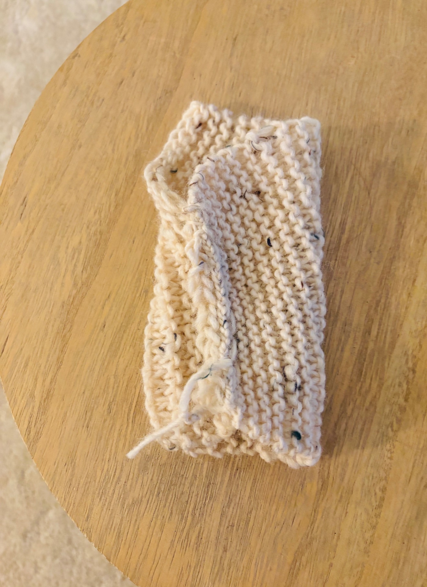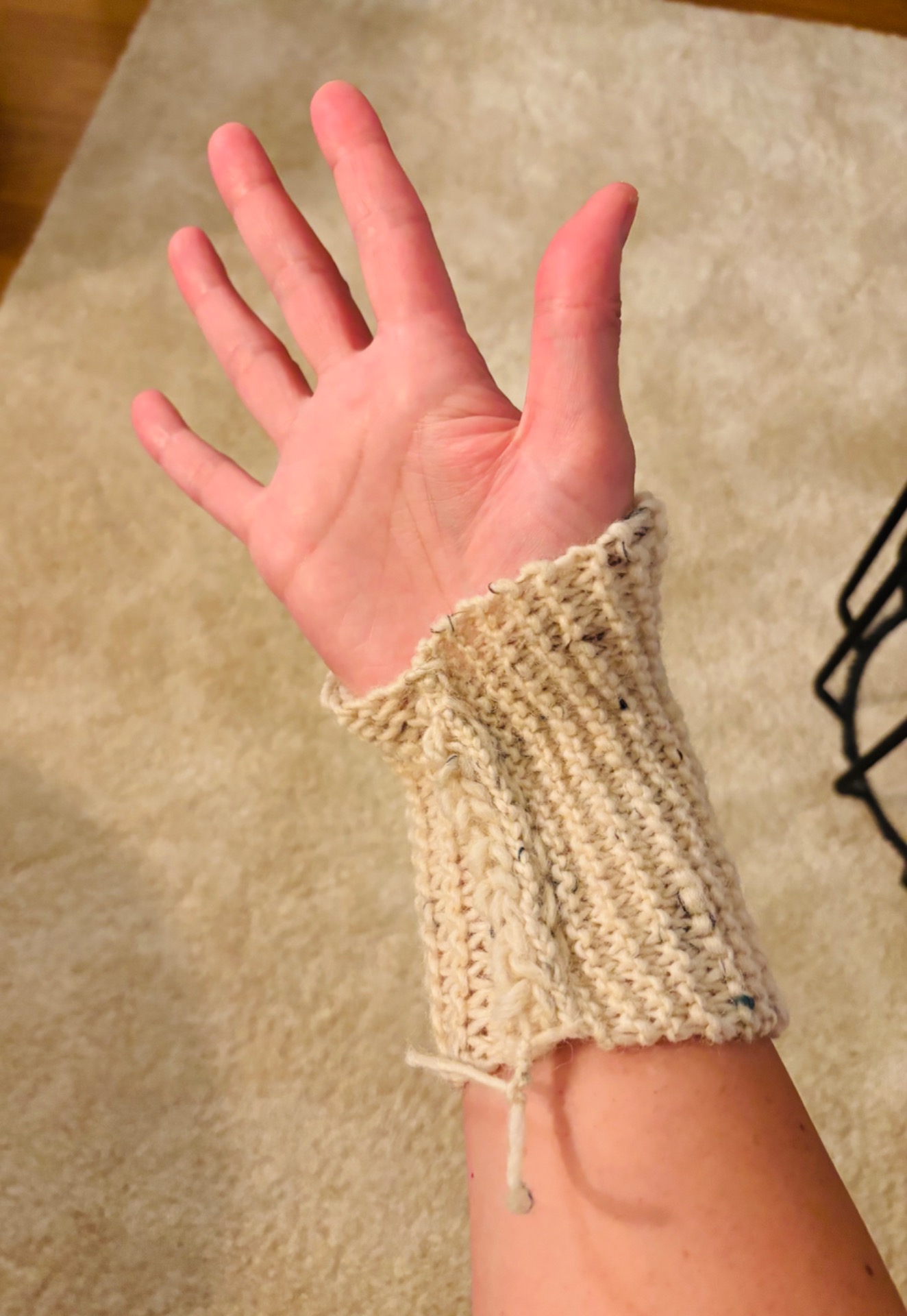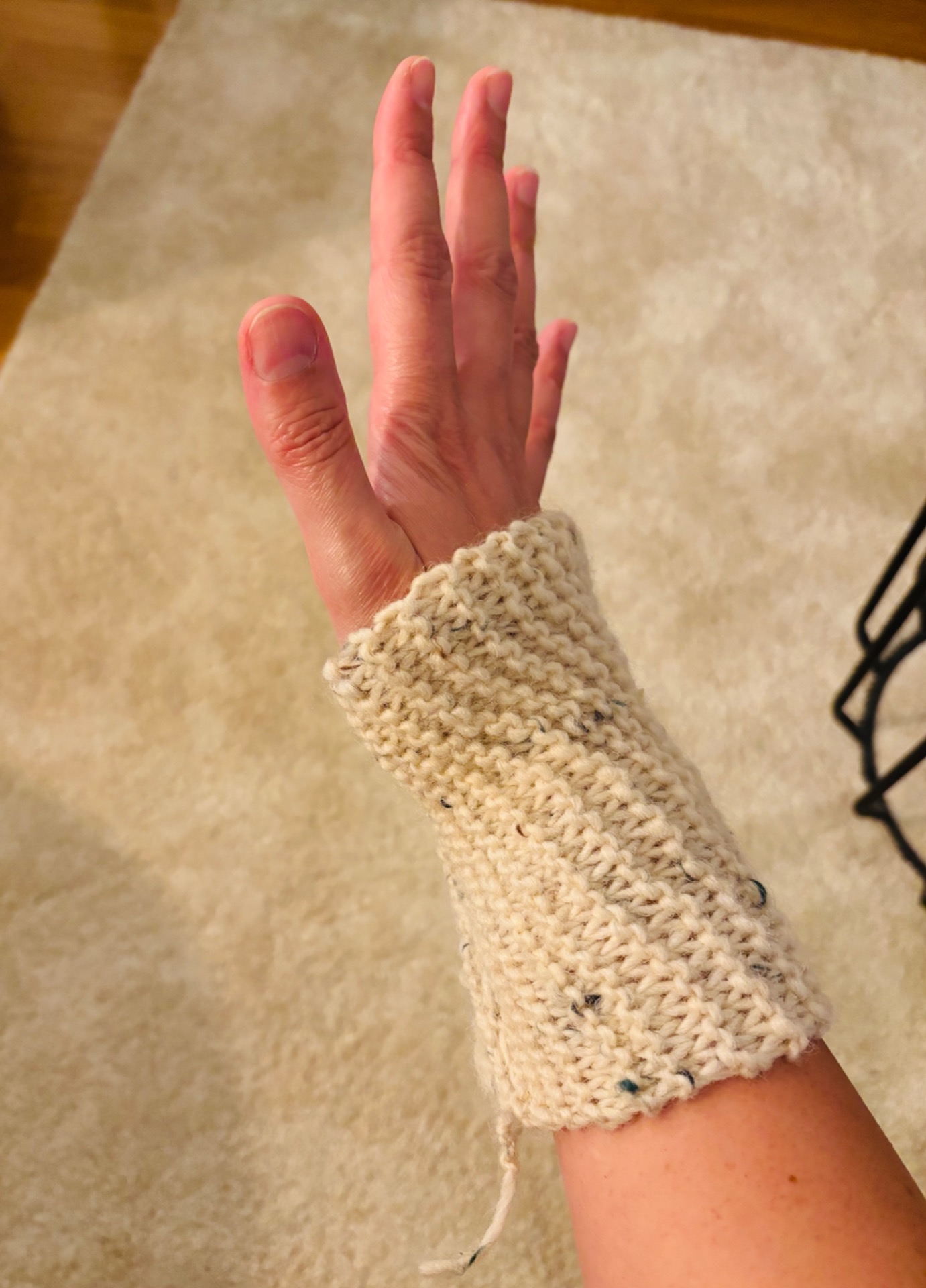 Handstickad handledsvärmare i en ljus färg med små färgade prickar. Den har en ribbstickad kant och en öppen design för tummen. 85% ull, 10% akryl och 5% viskos.