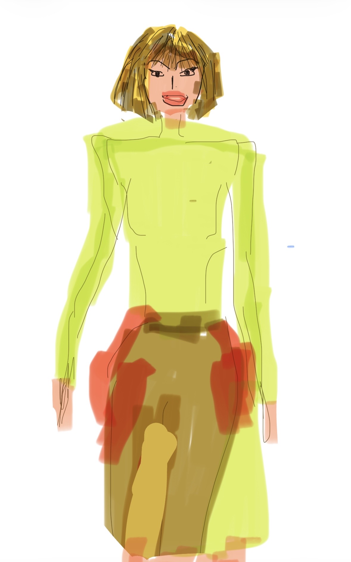 Ett gratulationskort, en skiss av en kvinna i en långärmad topp i en ljusgrön nyans. Toppen har en hög hals och en slät design.
