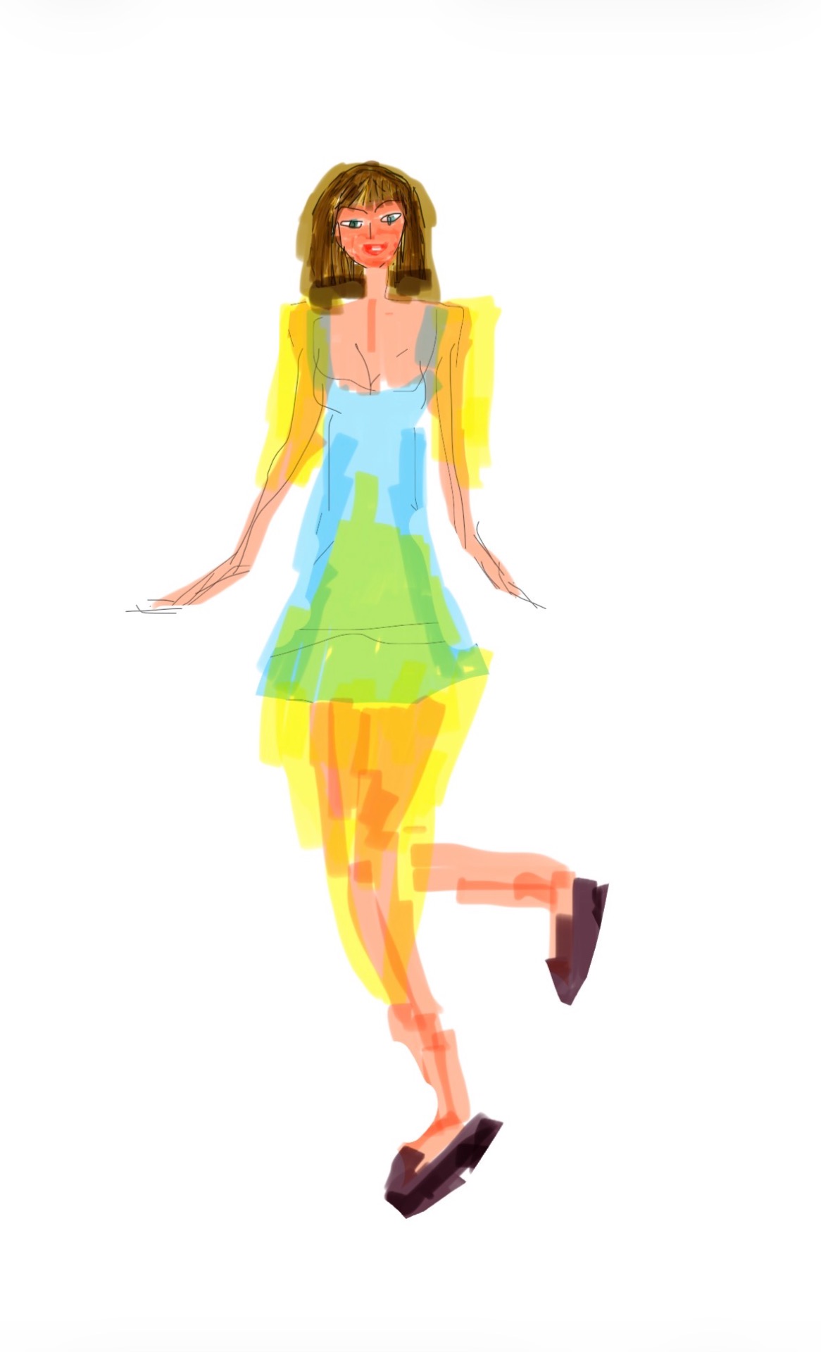 Ett gratulationskort, en illustration av en kvinna i en kort klänning. Klänningen är ljusblå upptill och går över i ljusgrön nedtill. Kvinnan har brunt hår och mörka skor.