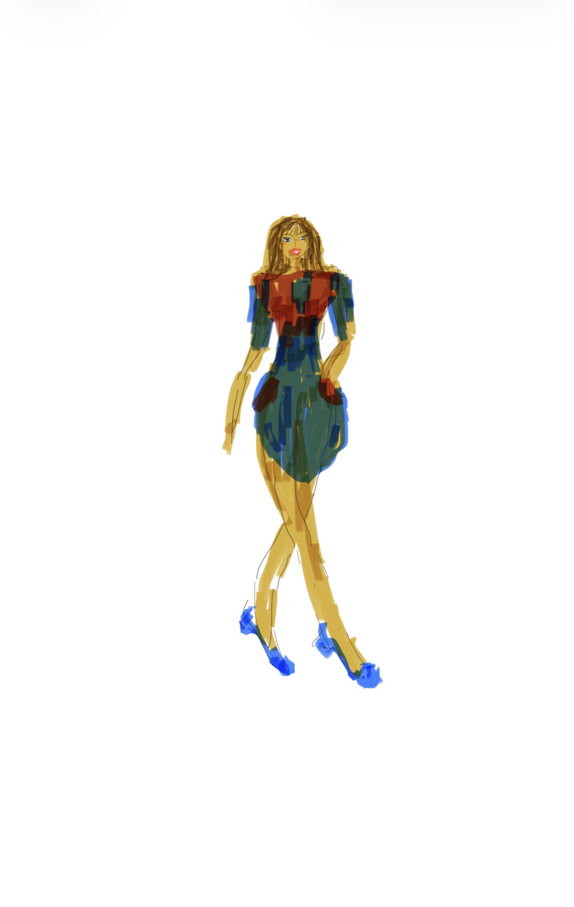Ett gratulationskort, en kvinna i en klänning med korta ärmar och rund halsringning. Klänningen har en avslappnad passform och fickor framtill. Designen inkluderar färgblock i rött, blått och grönt.