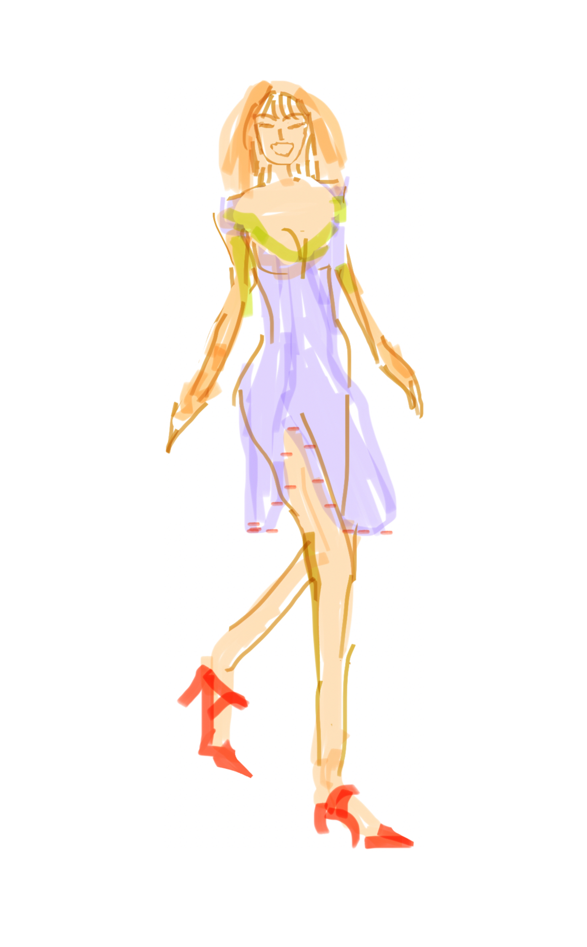 Ett gratulationskort, en skiss av en kvinna i en klänning i lila nyans med gröna detaljer vid halsen och axlarna. Klänningen har en kortare längd och röda skor.