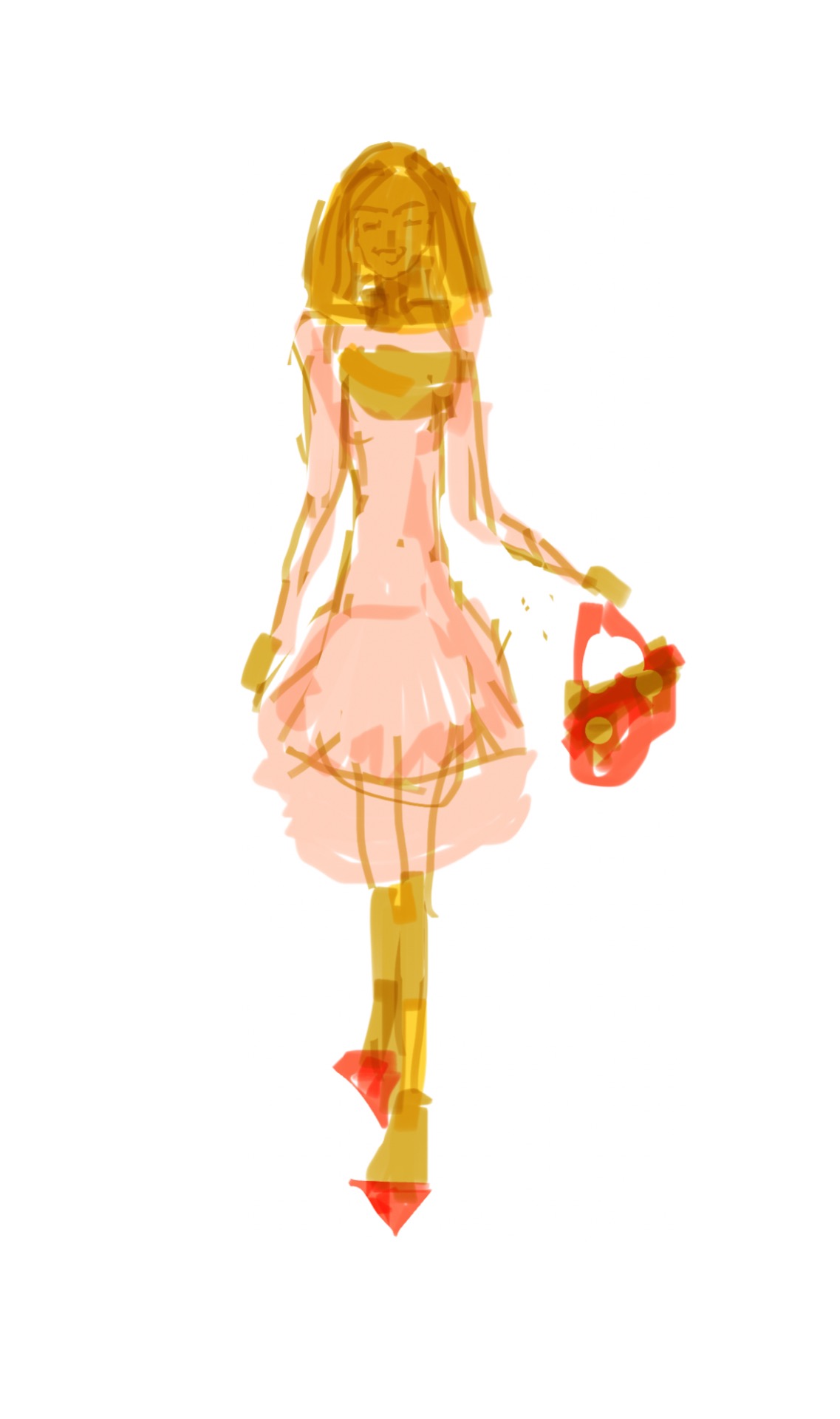 Ett gratulationskort, en skiss av en kvinna klädd i en ljusrosa klänning med en matchande handväska och röda skor.