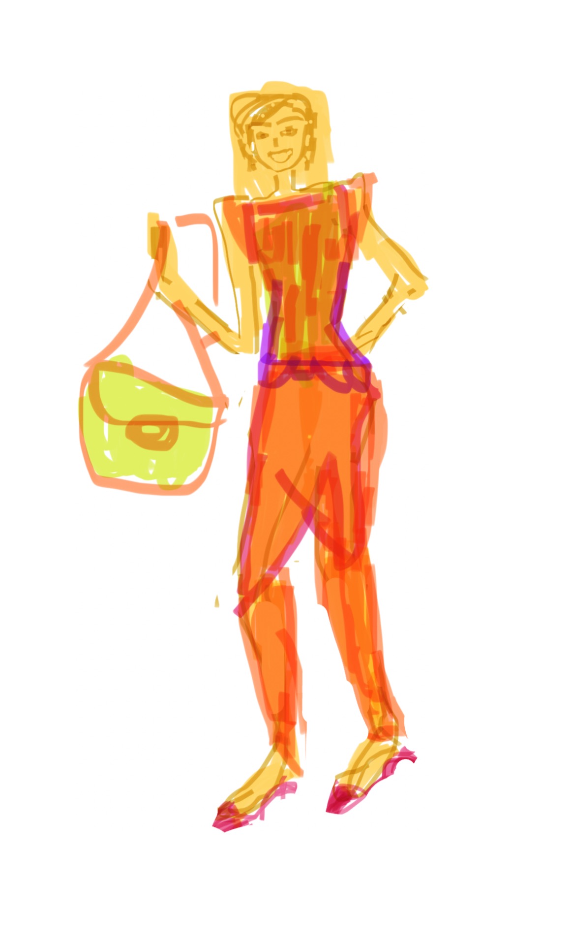 Ett gratulationskort, en skiss av en kvinna i en orange outfit med en grön handväska. Hon bär en topp och byxor, och har röda skor.