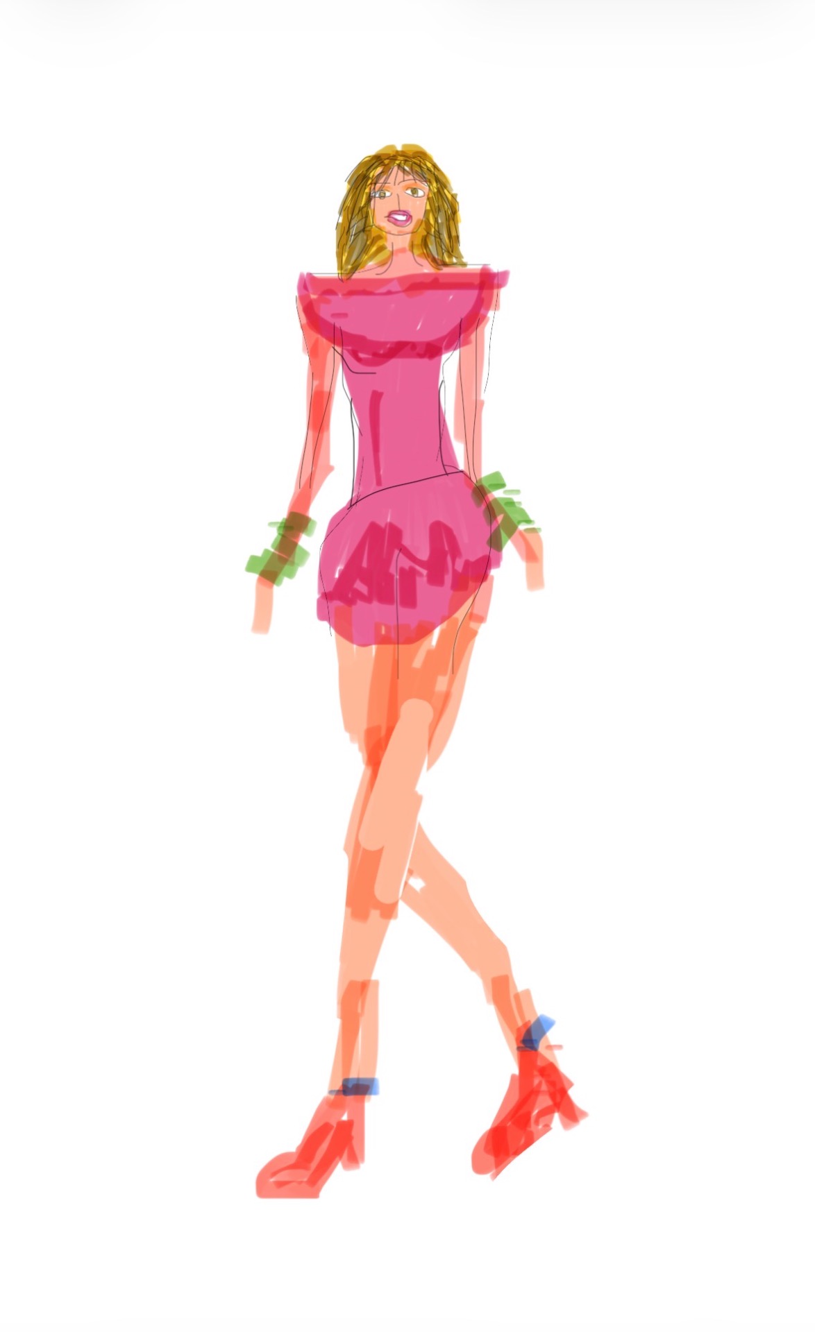 Ett gratulationskort, en kvinna i en klänning, en livlig rosa nyans med en figurnära passform upptill och en utsvängd kjol. Klänningen har en rak halsringning och korta ärmar.