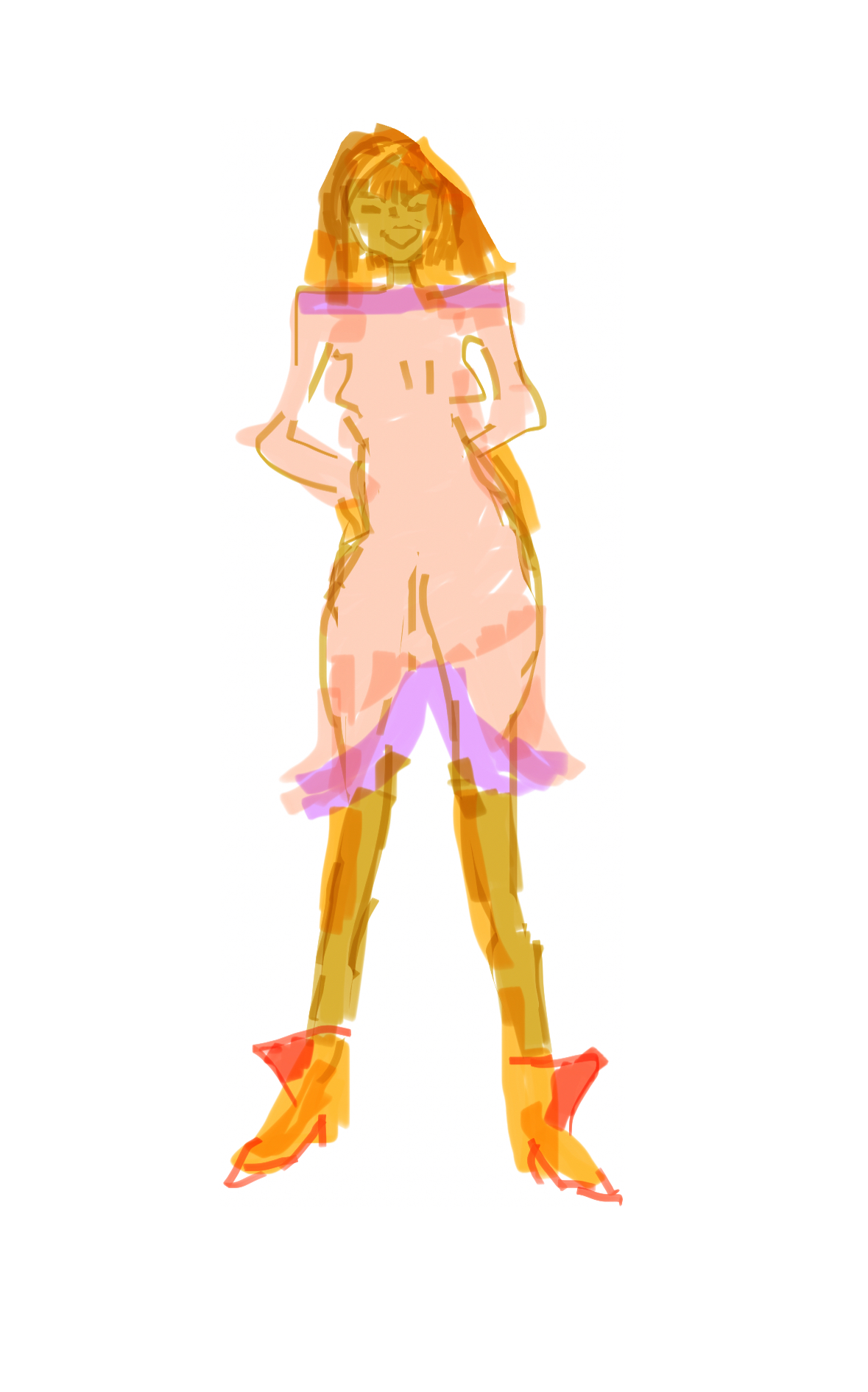 Ett gratulationskort, en skiss av en kvinna i en ljusrosa klänning med en lila detalj vid halsen och nederkanten. Klänningen har en fin design.