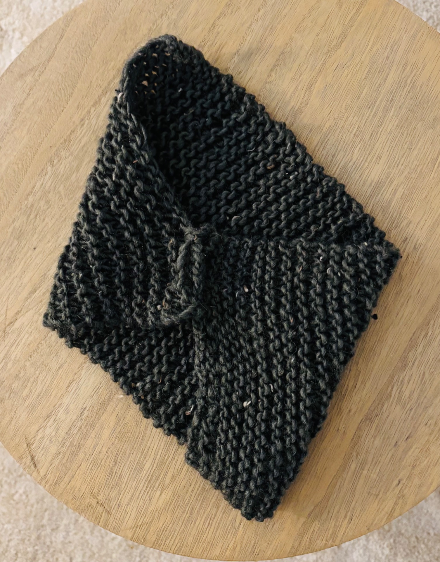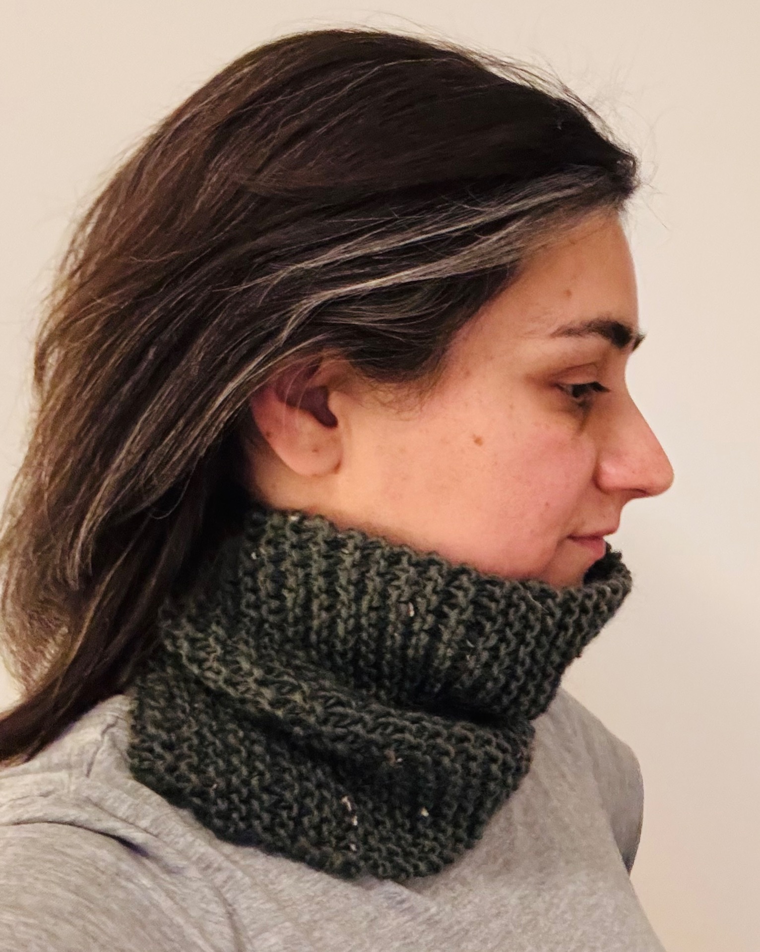 En stickad halskrage i en mörkare grön nyans. Den är designad för att hålla värmen runt halsen under kallare dagar. 85% ull, 10% akryl och 5% viskos.