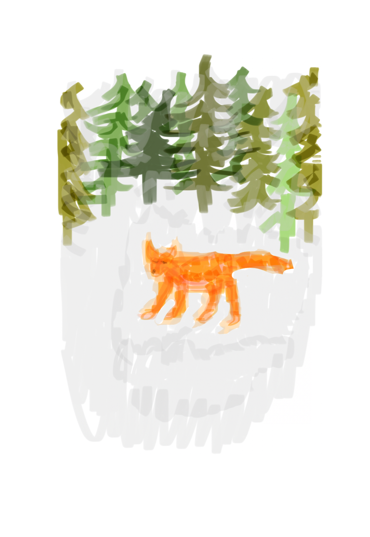 Ett vykort, en skiss som föreställer en räv i en skog i Sverige.