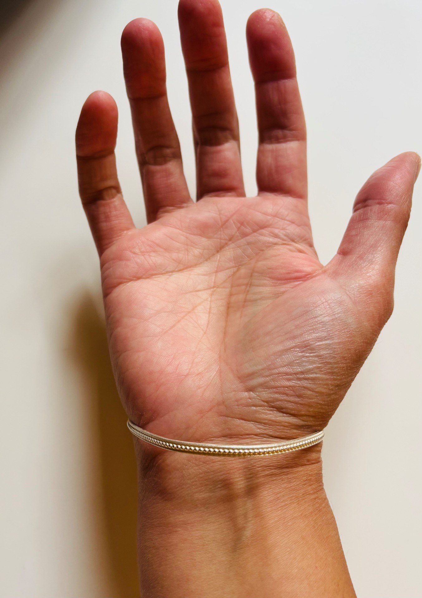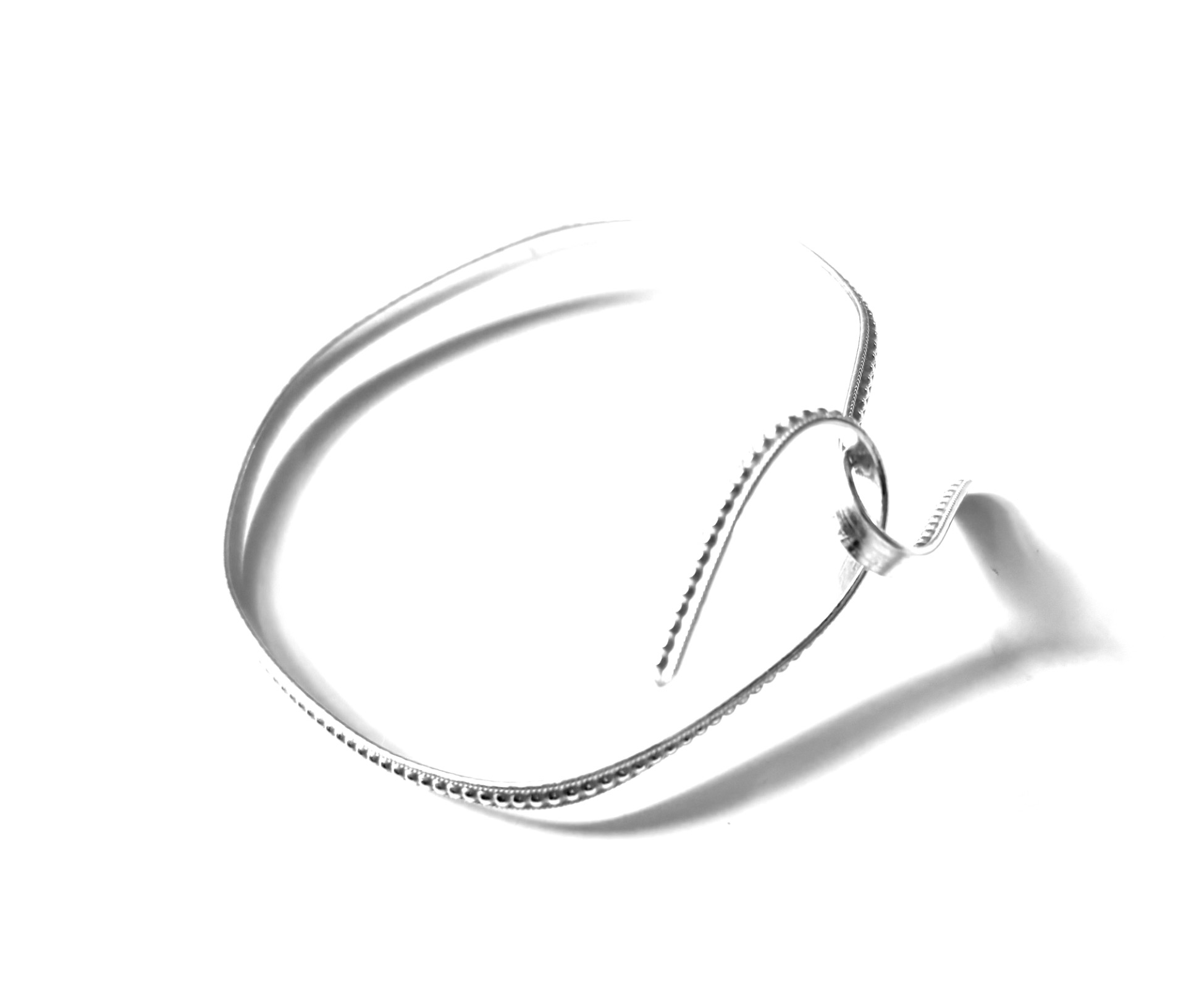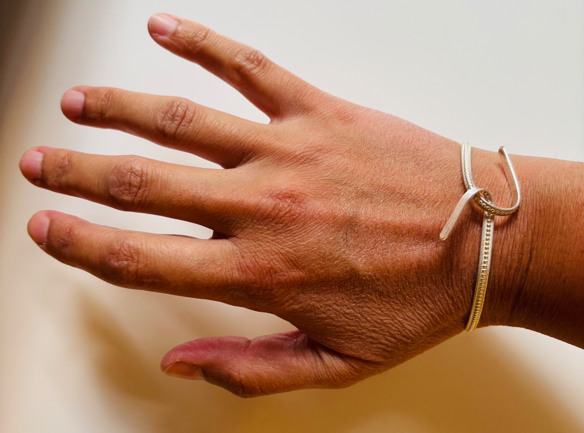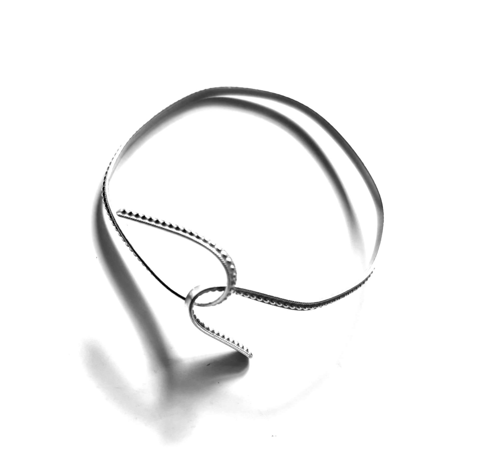 Ett elegant silver armband med dekorativa detaljer. Armbandet har en unik design med en öppen konstruktion och en liten knutdetalj. Den tillhör kollektionen höst och vinter 25/26. Handgjord av mönstrad silvertråd 935 med bredd 3,6 mm och höjd 1,4 mm.