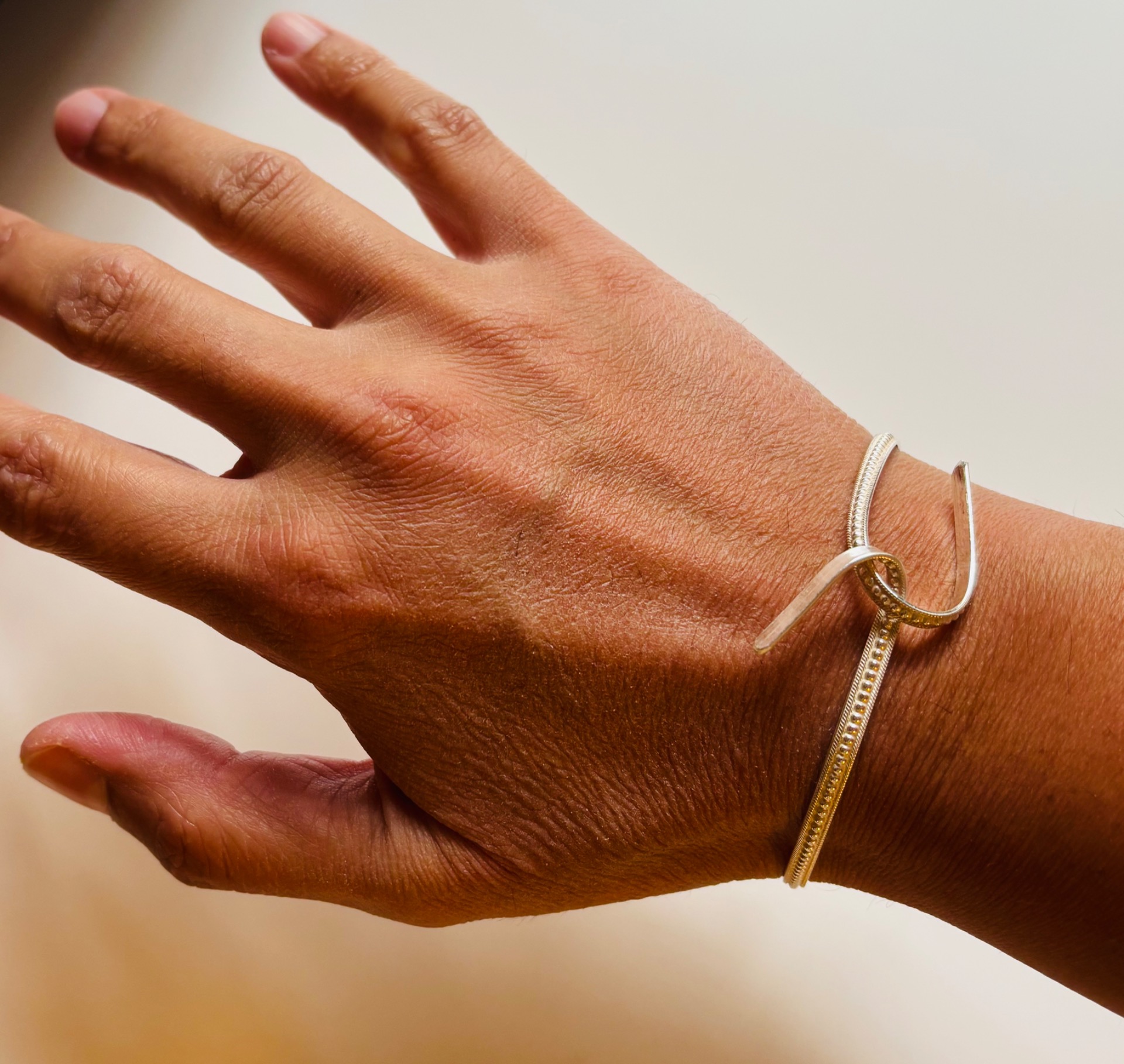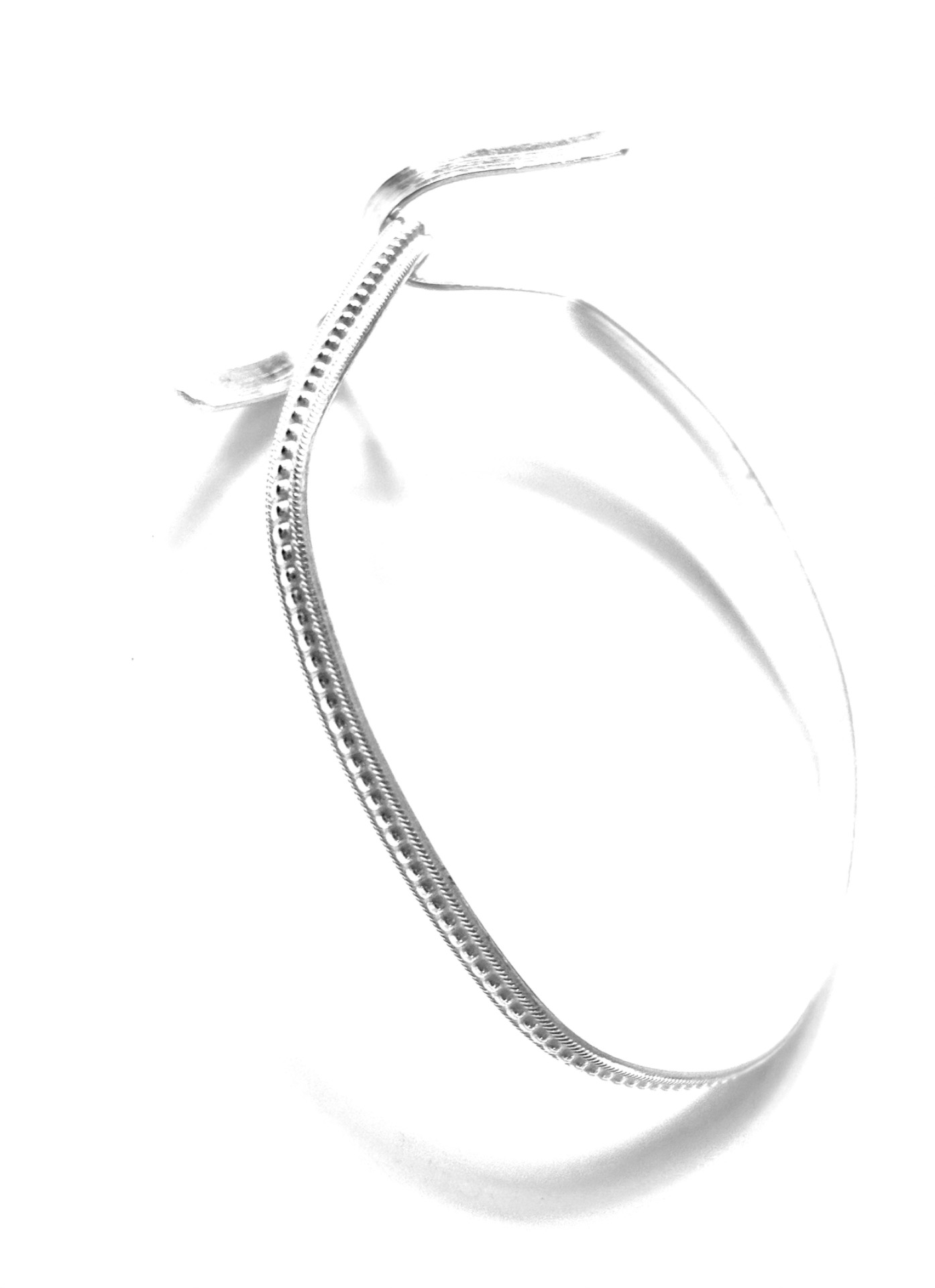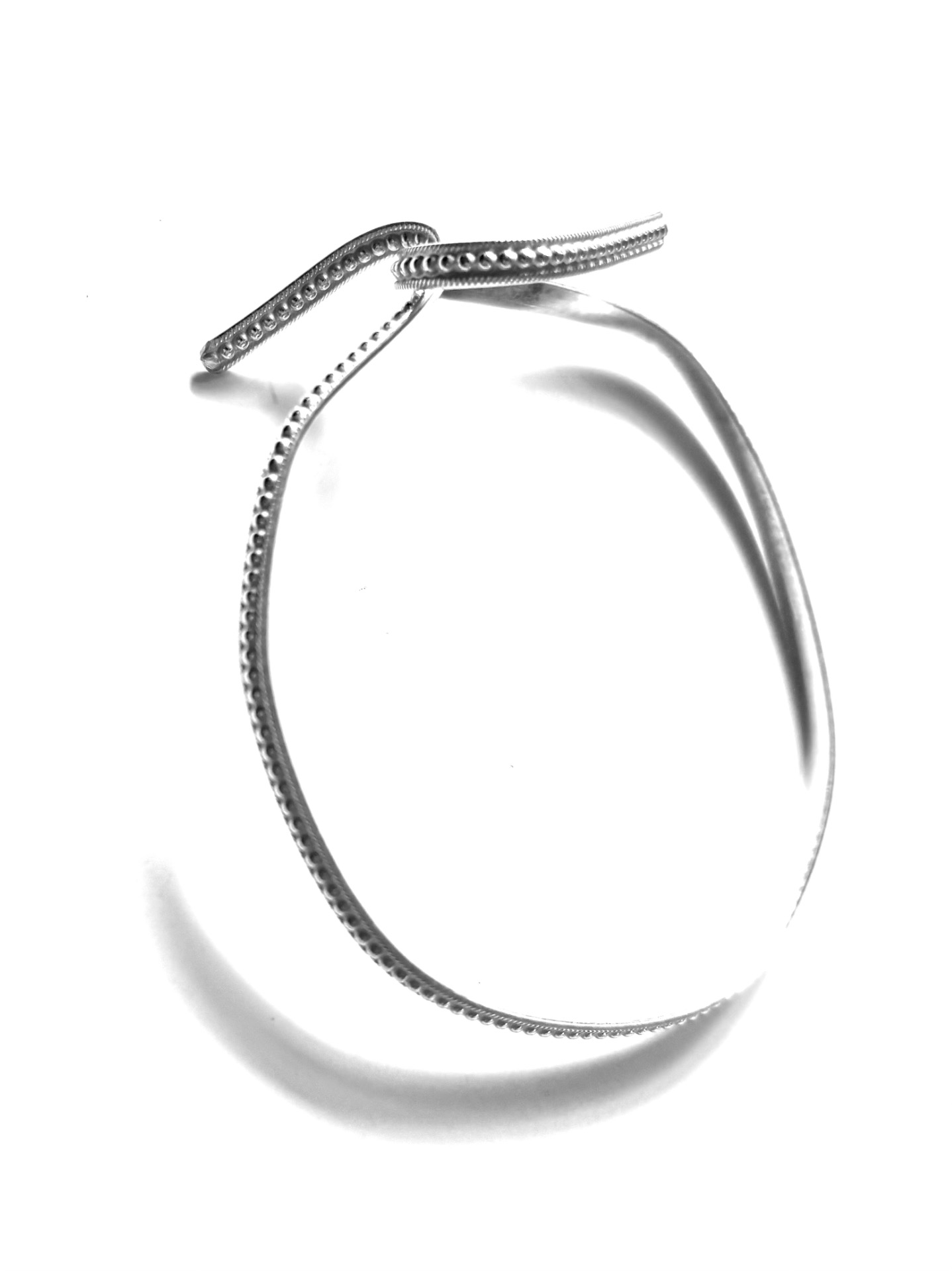An elegant silver bracelet with decorative details. The bracelet has a unique design with an open construction and a small knot detail. It belongs to the autumn and winter 25/26 collection. Handmade from patterned silver wire 935 with a width of 3.6 mm and a height of 1.4 mm.