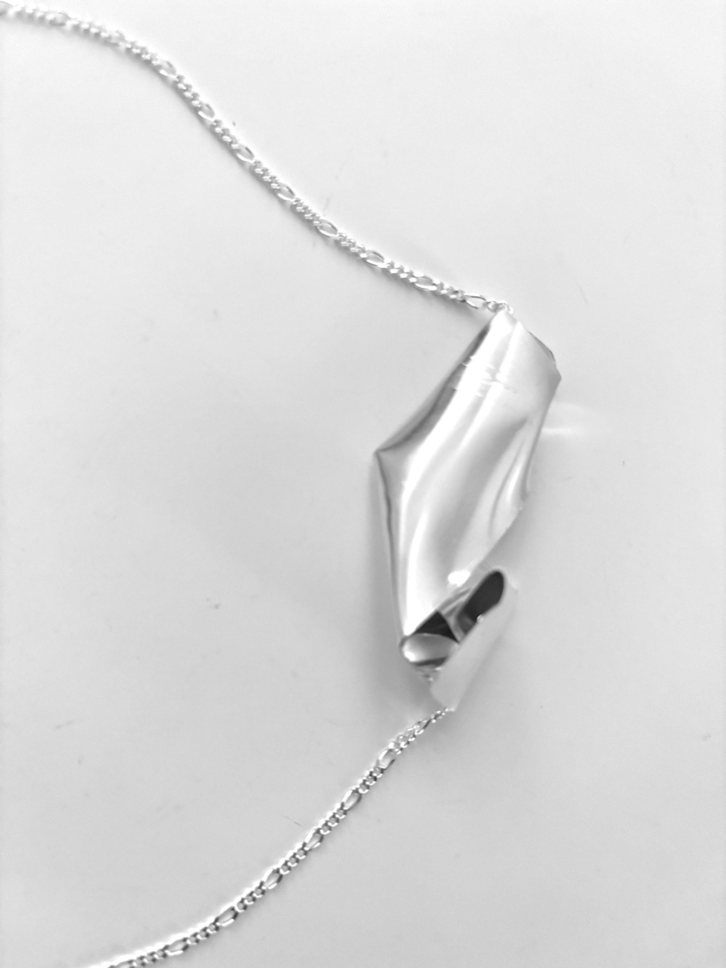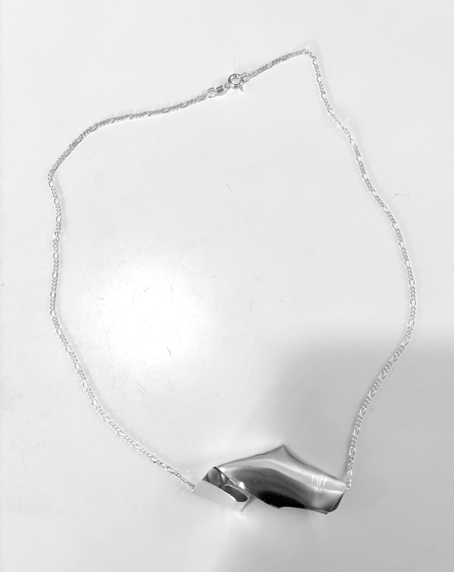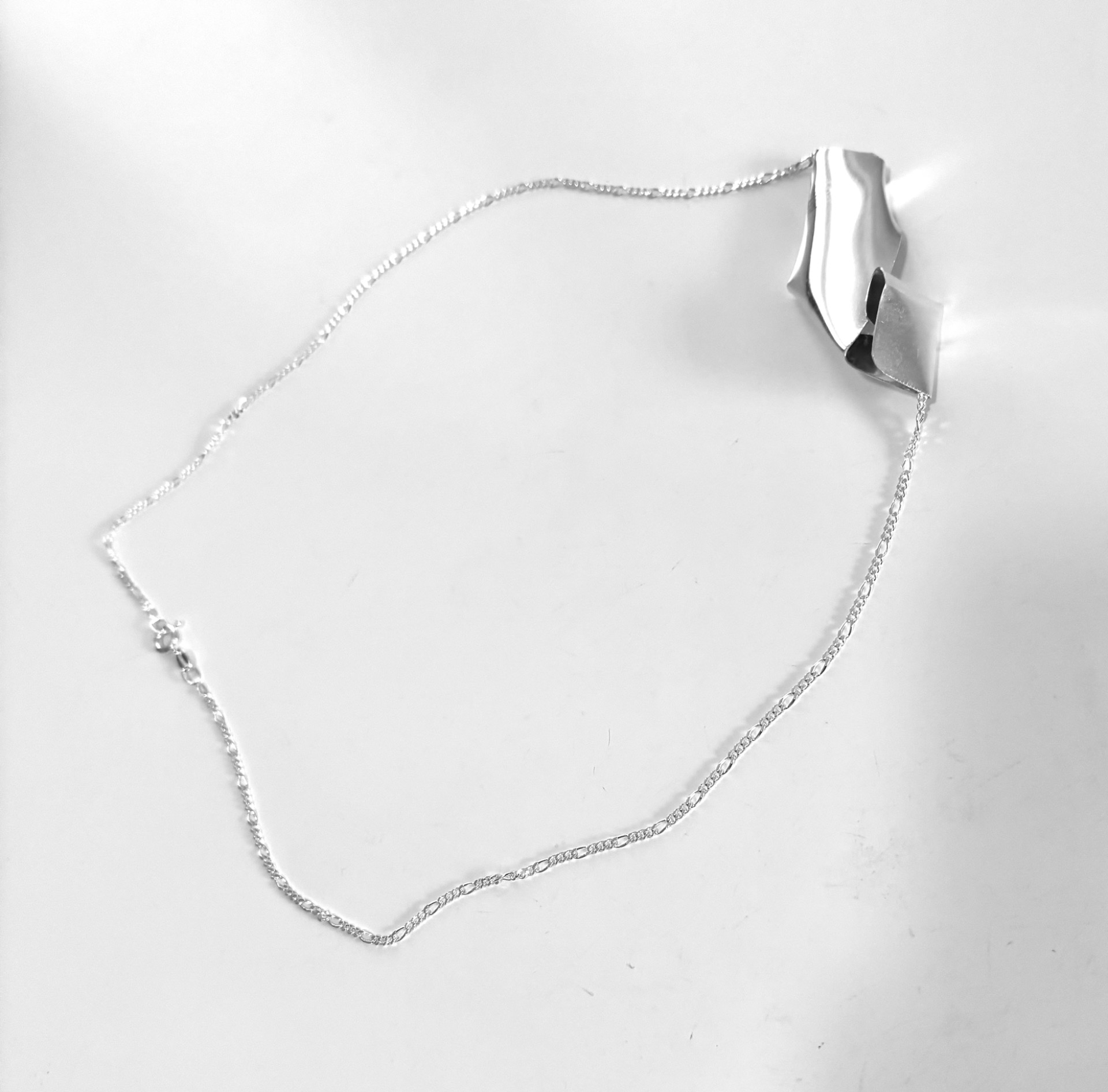 A stylish silver necklace with an abstract pendant. The necklace has a figaro chain in length 50cm with a secure clasp. Perfect for adding a tough touch to your outfit.
