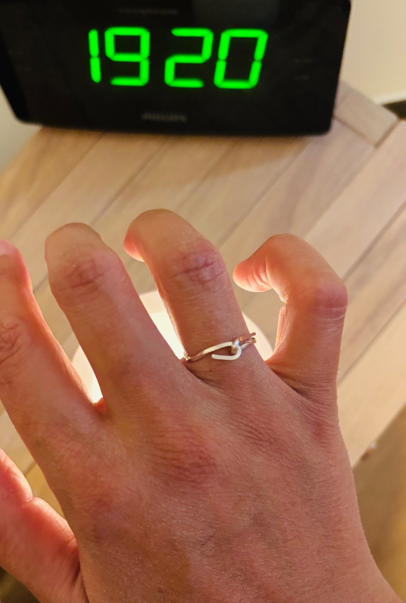 Stilig ring kallad 19:20. Den är handgjord av sterling silver 925, både böjd och vriden. Tillhör kollektionen höst och vinter 25/26.