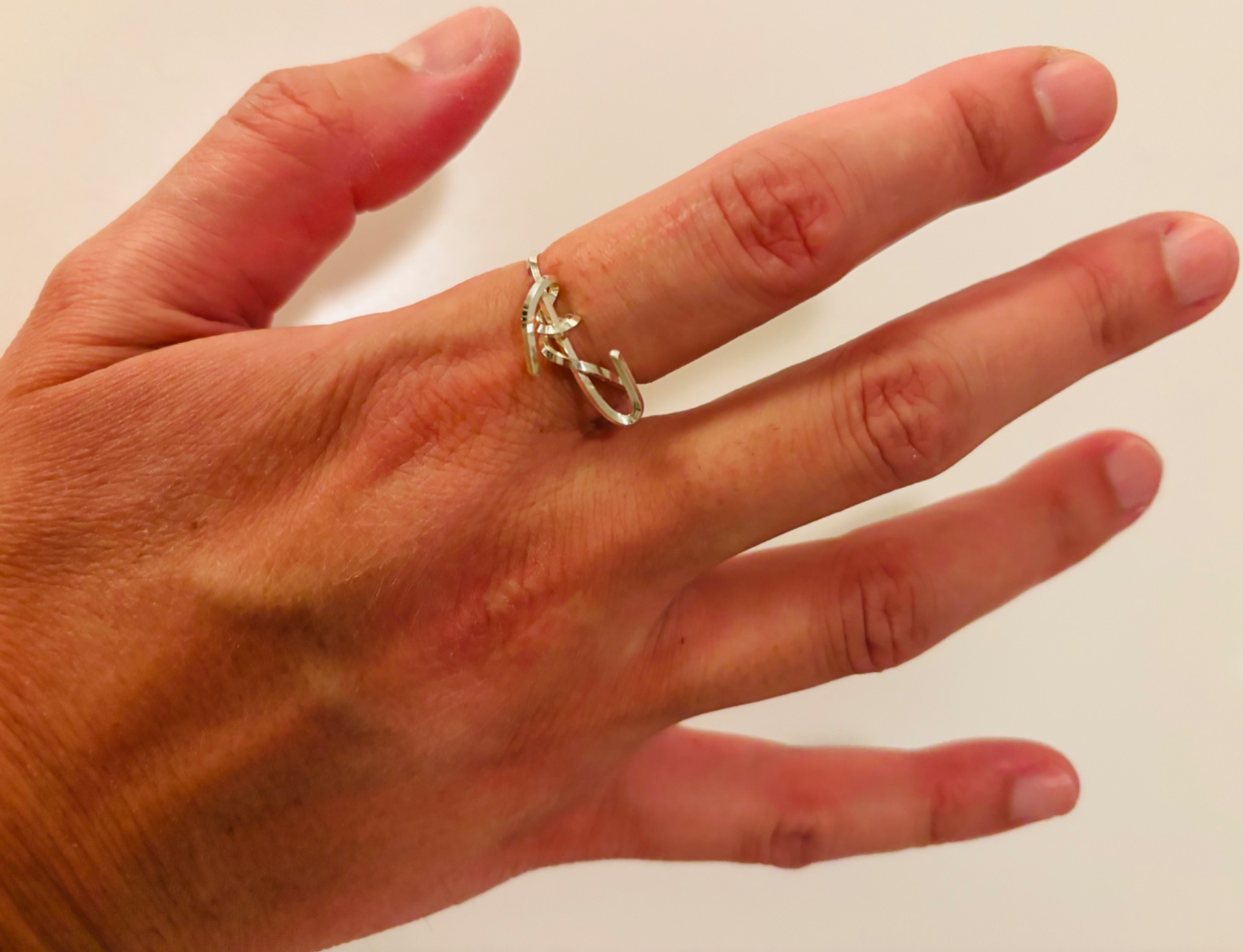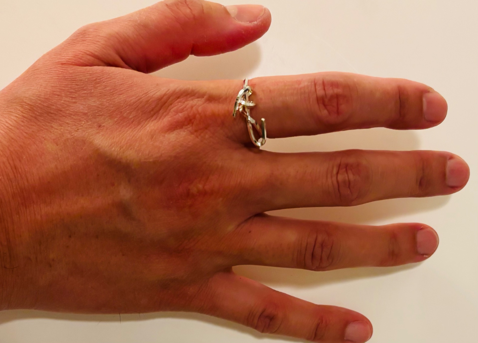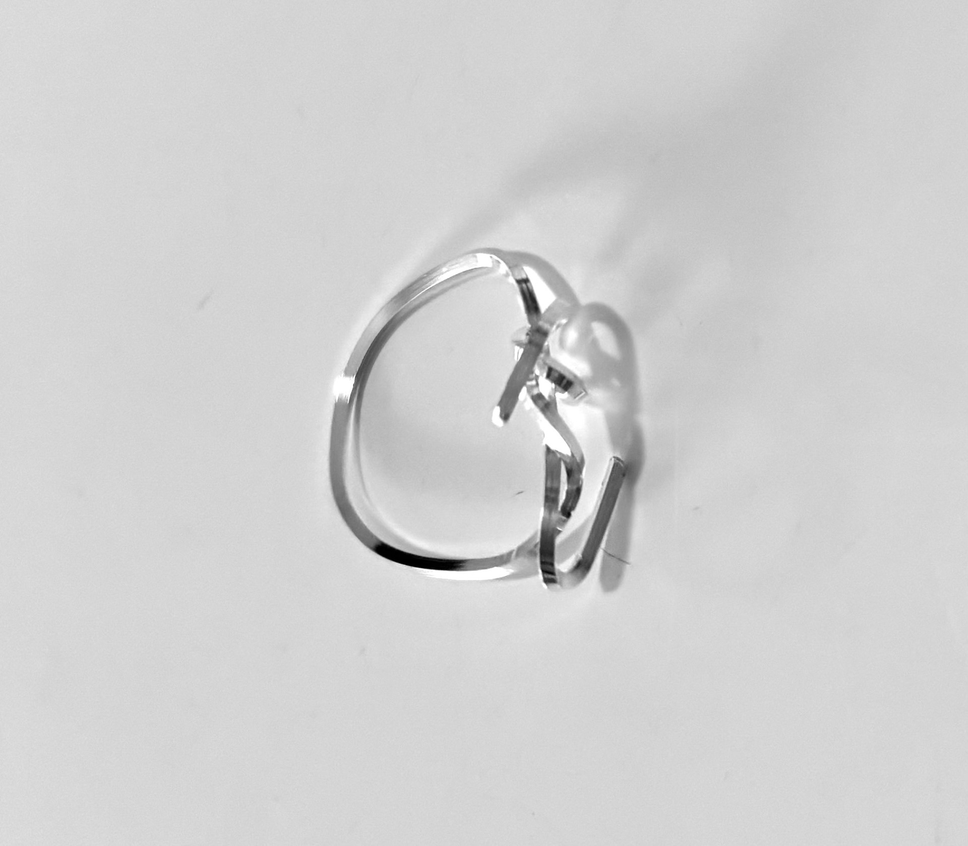 En sterling silver ring med en dekorativ design. Ringen har en intrikat form som ger den ett unikt utseende. Perfekt för den som söker en tuff accessoar. Storlek 18.5