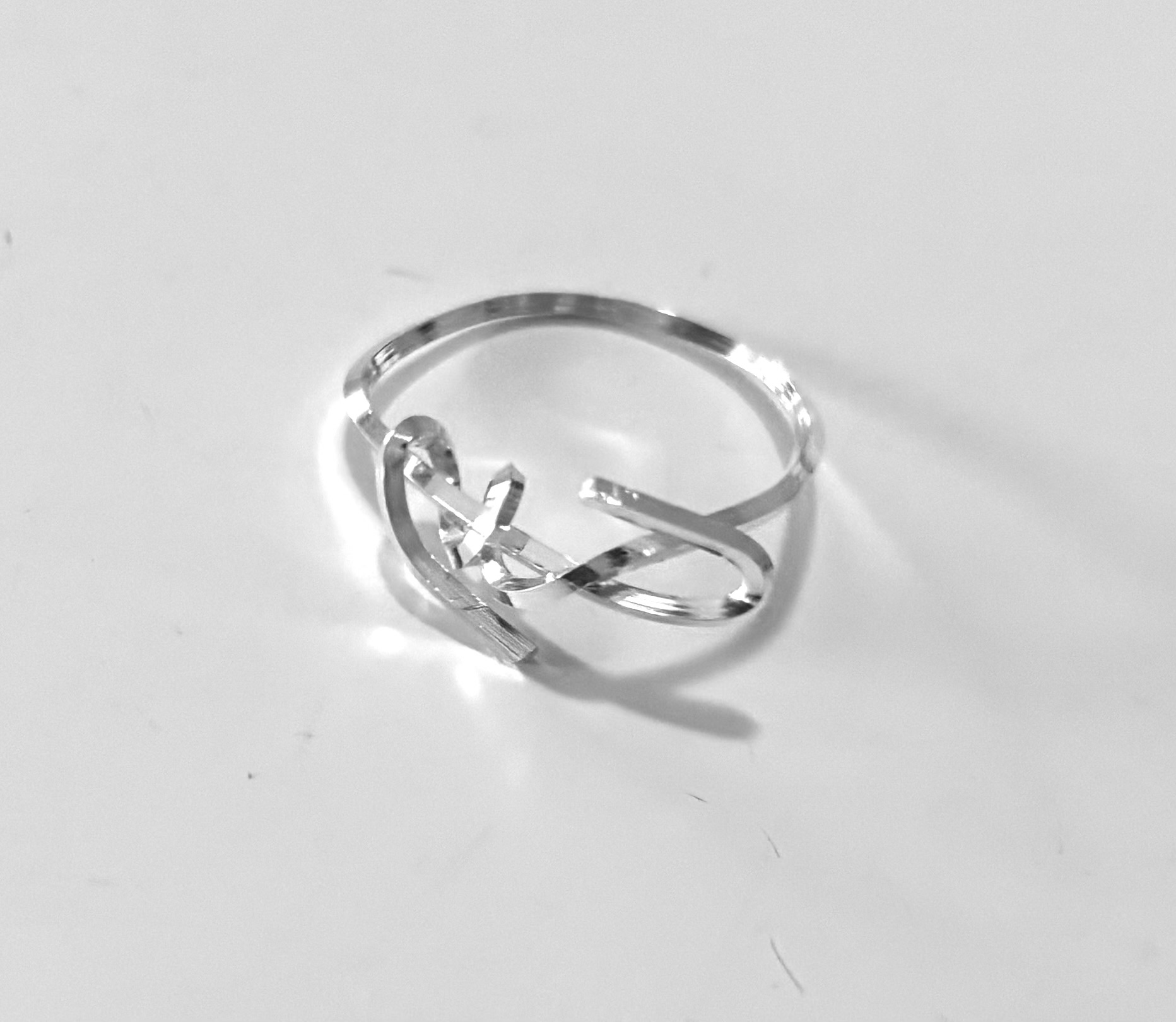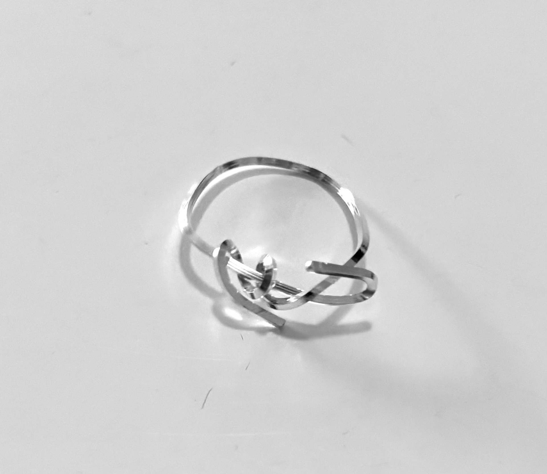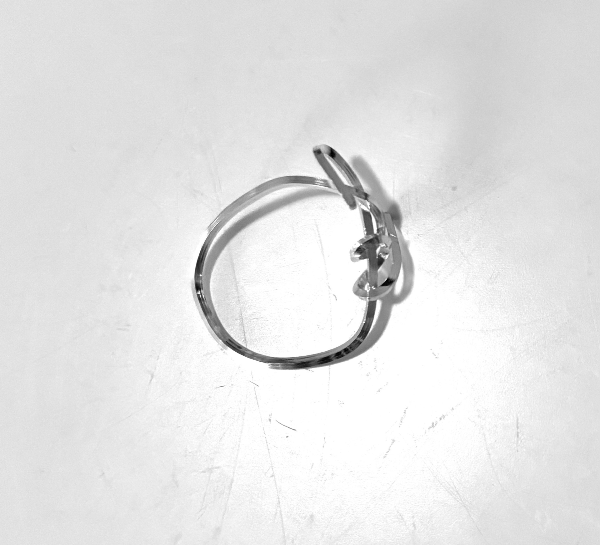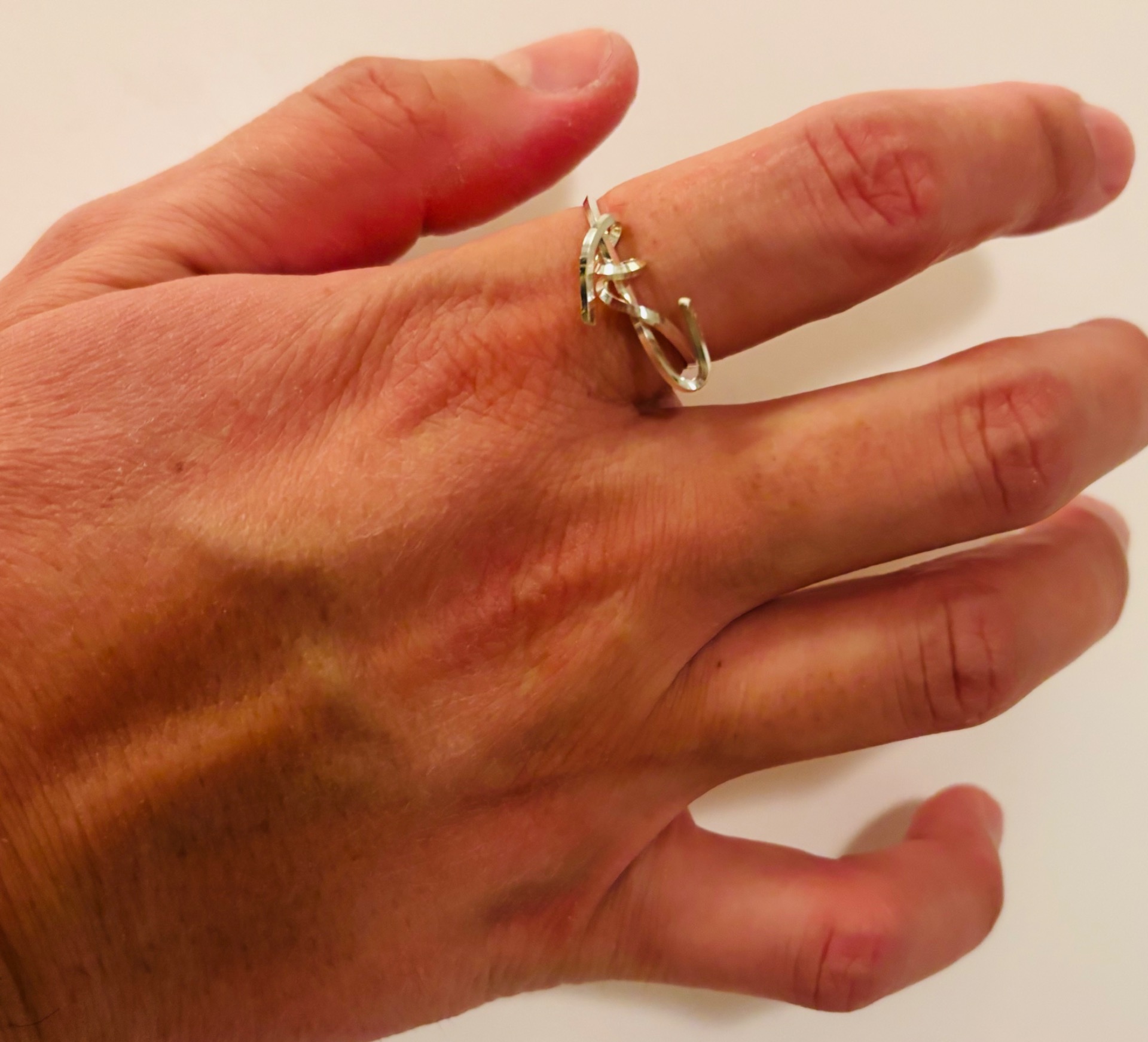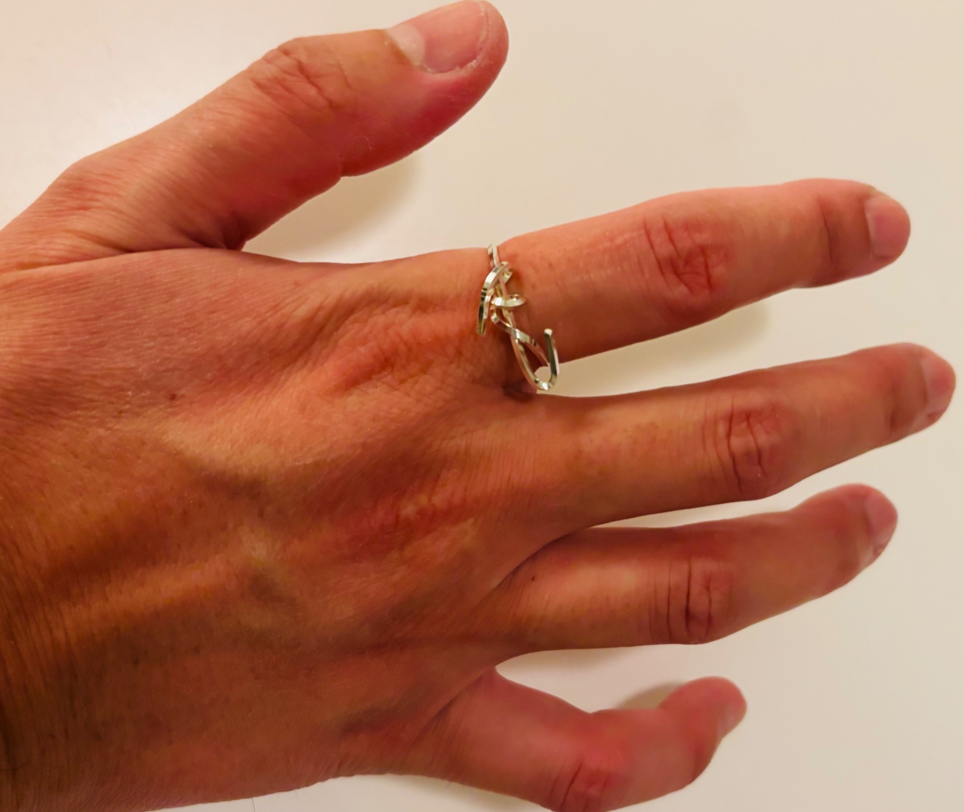 A sterling silver ring with a decorative design. The ring has an intricate shape that gives it a unique look. Perfect for those looking for a tough accessory. Size 18.5