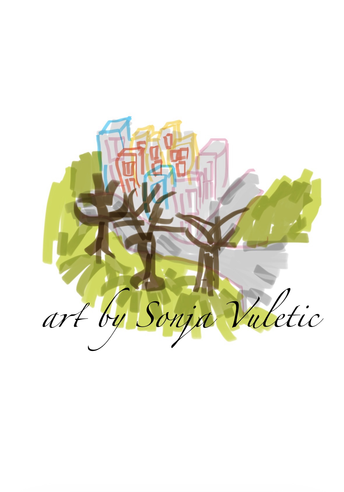 Ett vykort, ett konstverk med ett stadsmotiv och träd i förgrunden. Färgerna är ljusa och bilden är handritad digitalt.