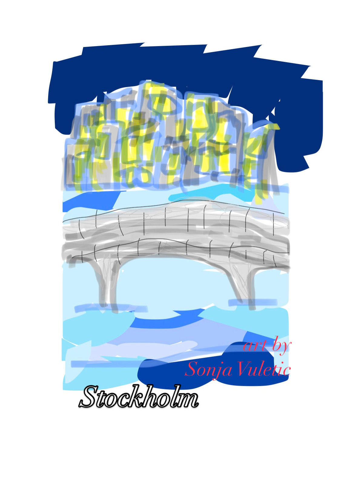 Ett vykort, ett konstverk med motiv av Stockholm. Bilden visar en stadssiluett och en bro över vatten. Skapad av Sonja Vuletic